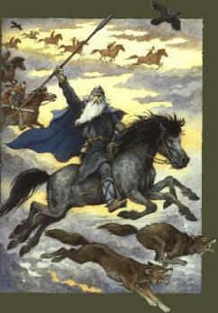 Hij geeft de zege in de strijd. Op zijn achtvoetige ros Sleipnir,