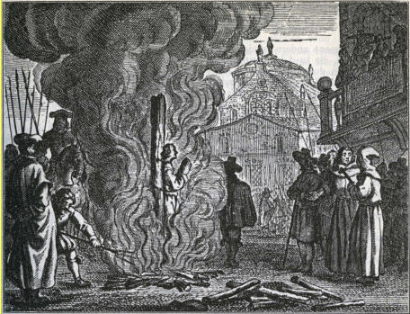 Foto boven: Een brandstapel Foto rechts: Een herdruk uit de vorige eeuw met zo’n 1600 executies